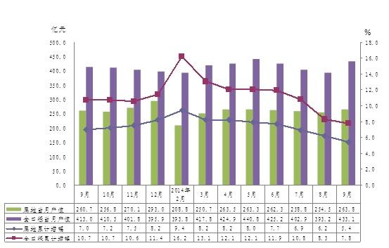 四、中小企业增长稳定。1-9月份,中小企业维持开年以来的高速增长,累计完成工业总产值1577.0亿元,同比增长8.4%,为规模以上工业产值增长贡献了5.7个百分点。
